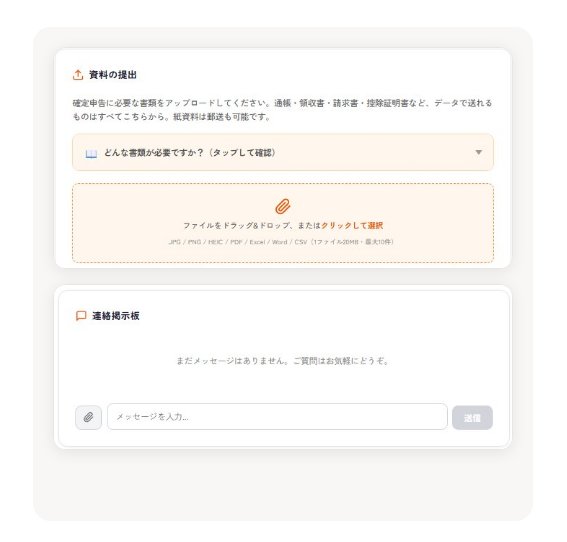 確定申告ドットコムでは、お客様一人ひとりに専用のマイページを付与します。画像アップロード機能や、連絡掲示板(チャット機能)を備えており、いつでも連絡が取れる状態です。